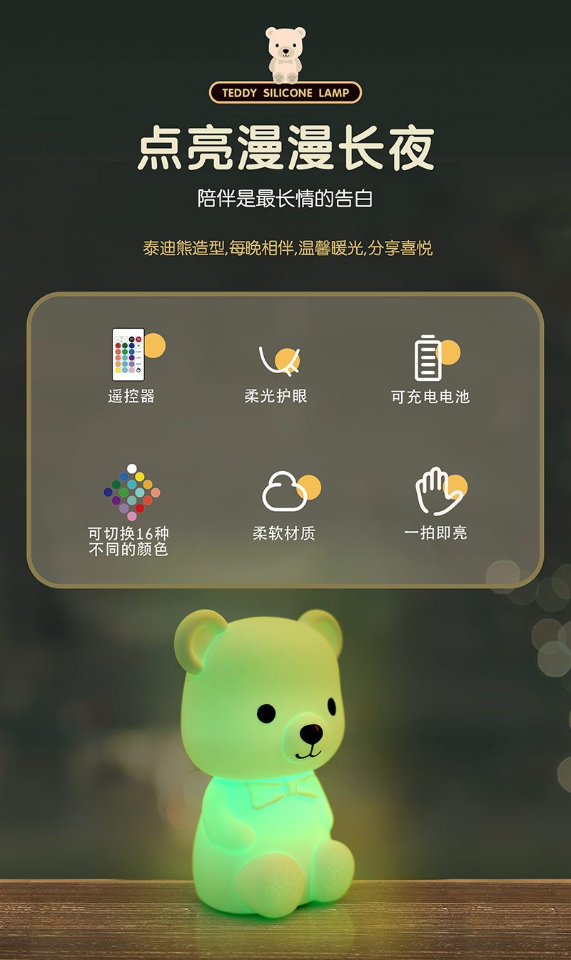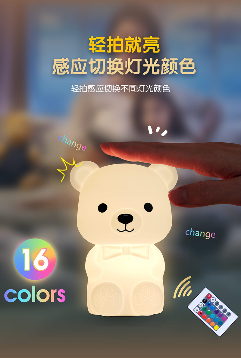 您的位置:首頁 > 產(chǎn)品中心 > 硅膠家居用品 > 拍拍燈 > 泰迪熊硅膠臥室氛圍床頭伴睡小夜燈拍拍燈廠家跨境批發(fā)