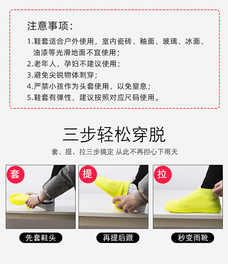 這款硅膠防水鞋套使用的時(shí)候就比較方便了,在需要使用的的時(shí)候把鞋套進(jìn)去就可以了,小巧方便,不占地方又不影響美觀,方便省時(shí),重要的是,即使是大雨磅礴的天氣,你的鞋子依舊可以完好無(wú)損。它使用的是食品級(jí)硅膠原材料制作的,環(huán)保安全,無(wú)異味,不會(huì)讓你聞到任何廉價(jià)塑料的味道。